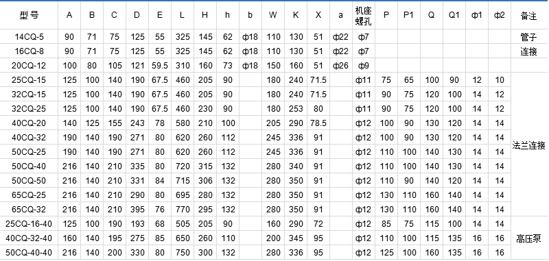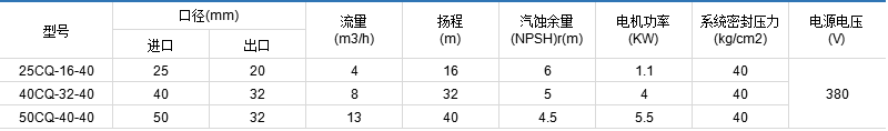 Performance parameters of CQ High Pressure Series Stainless Steel Magnetic pump