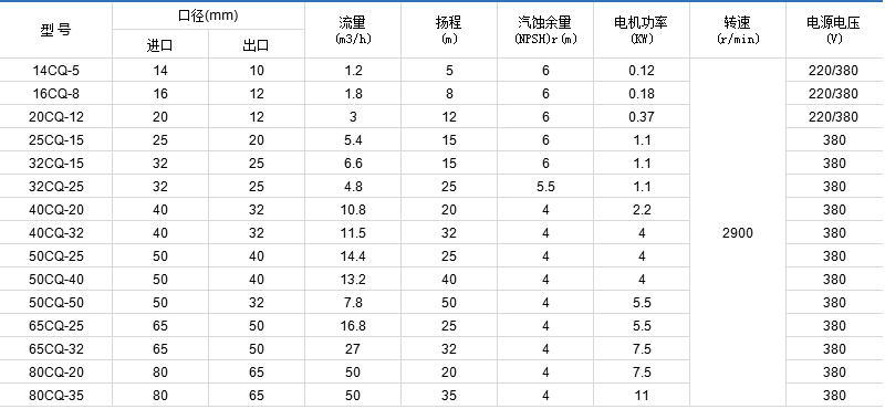 Performance parameters of CQ Series Stainless Steel Magnetic pump